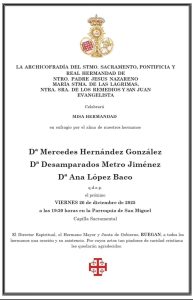 Será en sufragio de nuestras hermanas D.ª Mercedes Hernández González, D.ª Desamparados Metro Jiménez y D.ª Ana López Baco.
