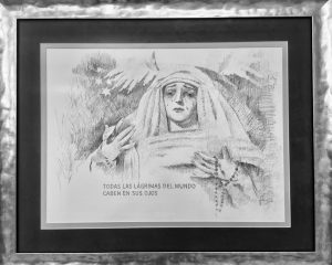 «Pinceladas de grafito sobre papel en blanco», la técnica que ha empleado el artista para reflejar a nuestra titular, bajo el lema : «TODAS LAS LÁGRIMAS DEL MUNDO CABEN EN SUS OJOS». Una singular obra en la que a través de sus trazos se puede observar la delicadeza, el realismo y la emoción que transmite mirar a Ntra. Sra. Mª Stma. de las Lágrimas.