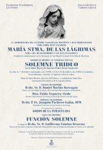 Durante los días 6 ,7 y 8 de diciembre tendrá lugar en honor a nuestra venerada titular Mª Stma. de las Lágrimas, el Solemne Triduo en su honor: