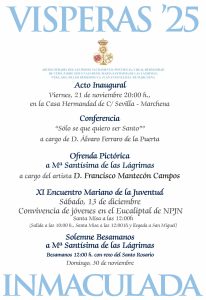 Se facilita el cartel “Vísperas ’25” organizado por la Archicofradía del Santísimo Sacramento, Pontificia y Real Hermandad de Nuestro Padre Jesús Nazareno, María Santísima de las Lágrimas, Nuestra Señora de los Remedios y San Juan Evangelista de Marchena.